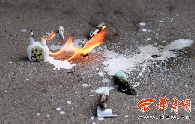 由于7支外包裝均為塑料材質(zhì),液體在塑料包裝內(nèi),當塑料包裝遇明火燒毀后,修正液瞬間引燃,火苗要比塑料燃燒得更旺。其中那只無任何警示標識的修正液,火勢較為猛烈,燃燒的修正液流到地上,火仍未熄滅。