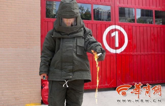 消防官兵點燃一支外形較長的修正筆,10秒鐘后修正筆筆頭被燒爛引燃了里面的修正液。當消防官兵每捏一下修正筆,火舌直接從筆頭向外噴出一米遠。